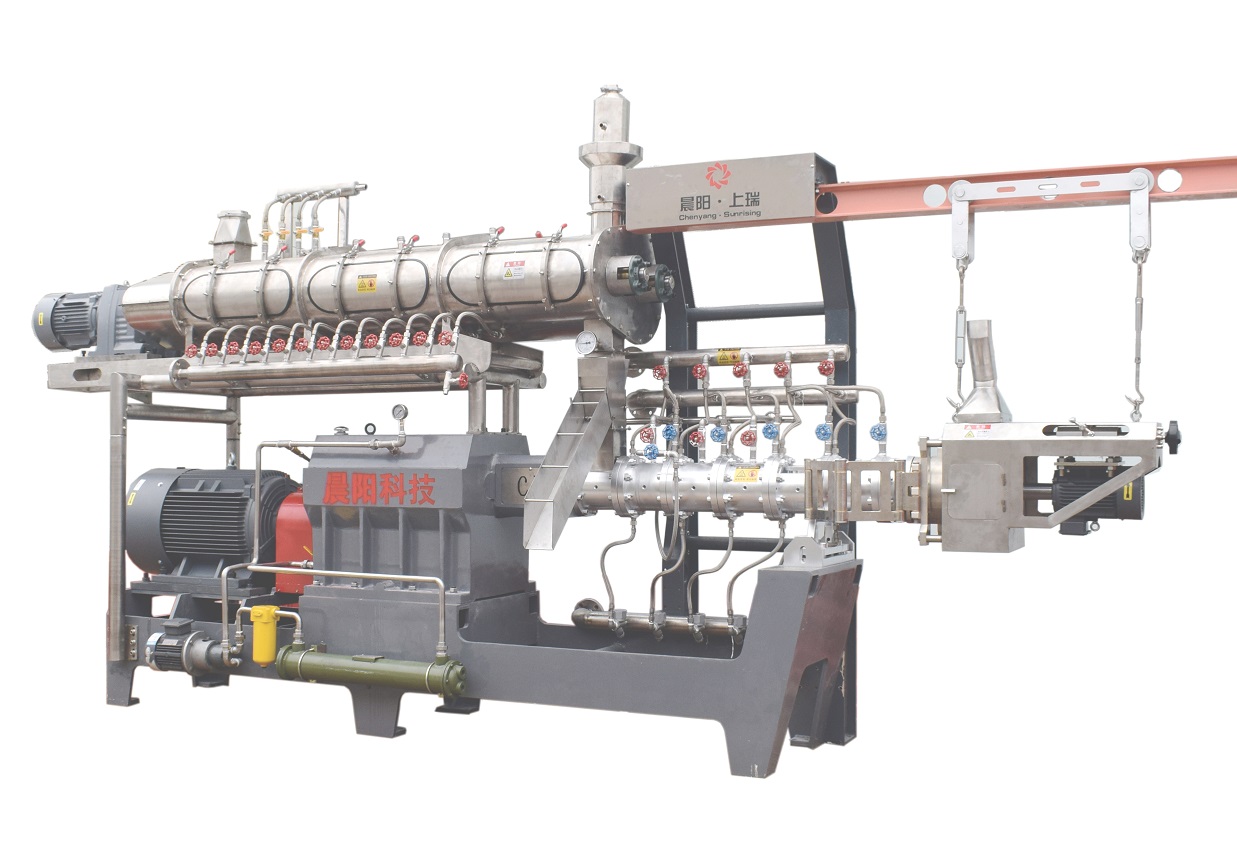 6.加 水進(jìn) 入擠 壓 機(jī) 是 為 了 更 好 的 調(diào) 和, 如 果 加 水 過(guò) 度 就 會(huì) 使 產(chǎn) 品 有 小 尾 巴, 結(jié) 塊 和 產(chǎn) 品 的 相 互 粘 結(jié)。 達(dá)到12%的 水 可 以 加 入 擠 壓 機(jī)( 正 常8% 多 一些), 達(dá) 到1% 的蒸 汽 可 加 入 擠 壓 機(jī)。