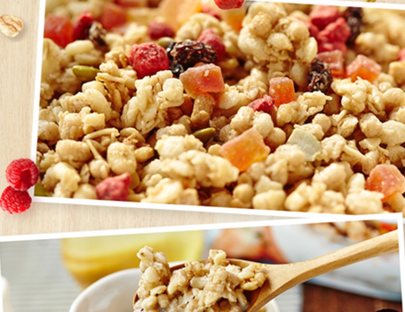 早餐水果麥片選用燕麥,再加上膨化谷物脆經(jīng)過混合噴涂低溫烘培后,混合果干、堅果等產(chǎn)品,富含膳食纖維和維生素,是營養(yǎng)豐富的早餐選擇。既可以直接干吃,使口感酥脆可口。也可配上牛奶和酸奶,口感會更加,吃起來酸甜酥脆,倒入直接拌勻即可吃,無需等待,完全不用擔(dān)心清晨時間不夠。是新時代早餐產(chǎn)品新需求。